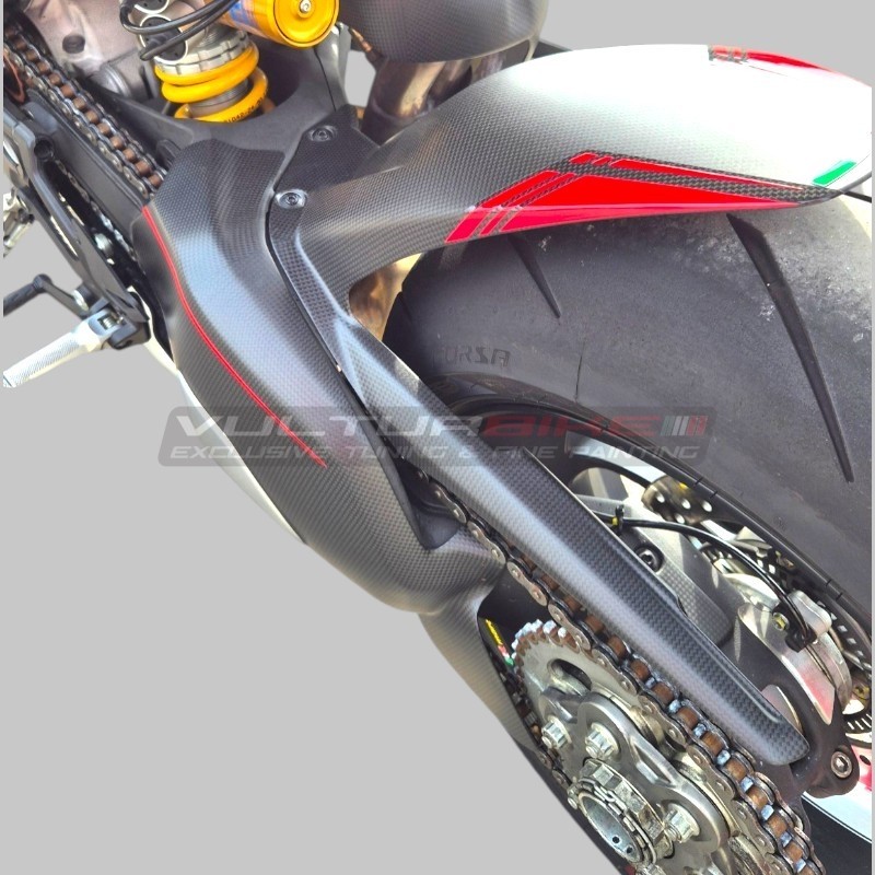The swingarm protector for DUCATI STREETFIGHTER V4/S is a carbon fiber component that replaces the original part and improves the aesthetic appearance of the motorcycle.
