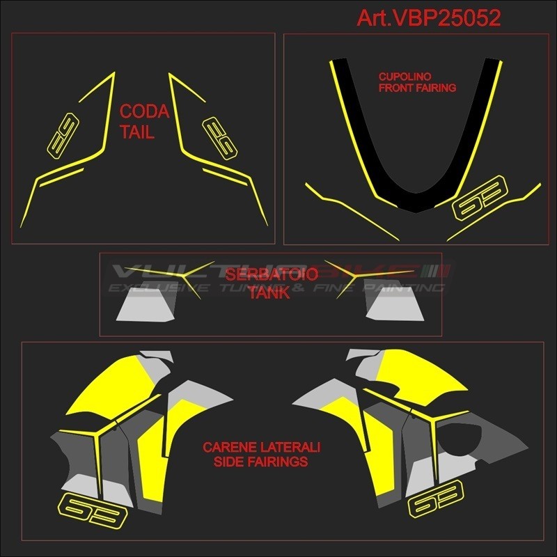 This adhesive graphic is designed and "designed" directly on the fairings of the bike, so that the lines respect the shapes and curves of the model in question. The adhesive films used are durable and resistant to atmospheric agents.
