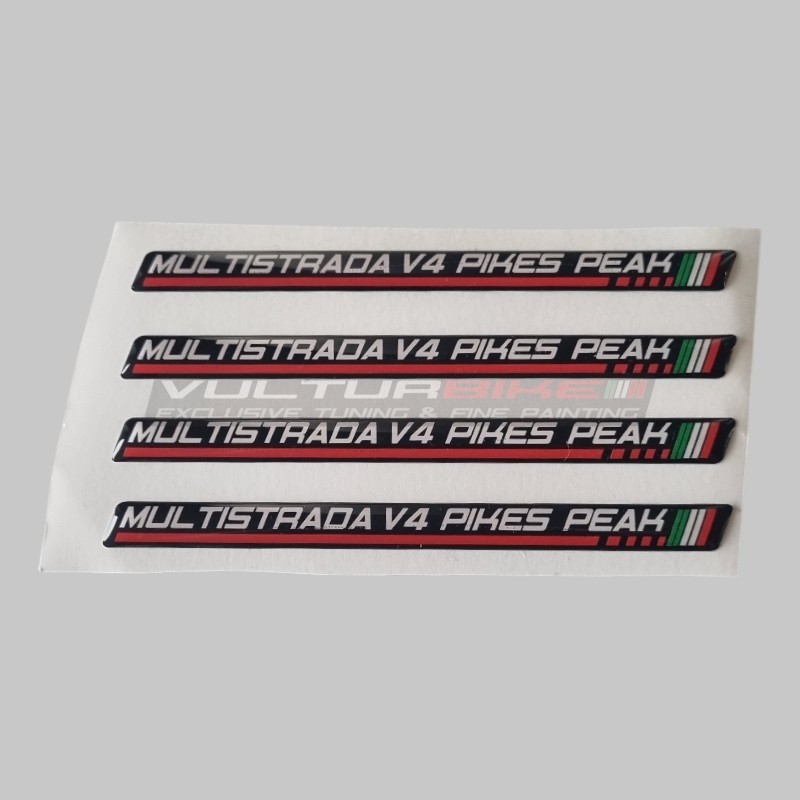 Kit de pegatinas de resina con efecto 3D, que muestra la Multistrada V4 Pikes Peak letras y la bandera italiana tricolor, visible en la foto.