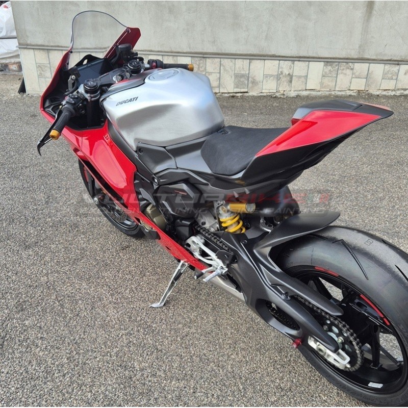 Tapa del depósito en fibra de carbono fina para Ducati Panigale / Streetfighter V4 pintada con el exclusivo efecto aluminio cepillado.