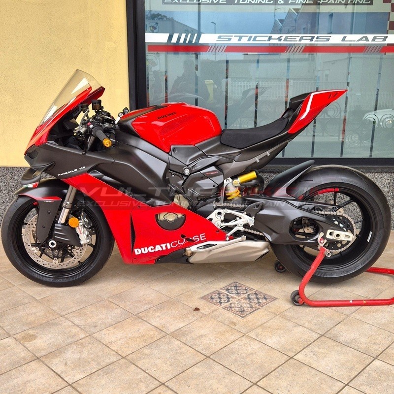 Cola en fibra de carbono fina con un nuevo diseño de diseño propio, pintado en línea con la librea Panigale V4R.