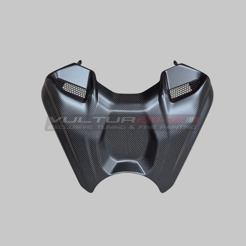 Cubierta de batería de fibra de carbono Ducati Streetfighter V4, completa con apéndices laterales de goma ya instalados en el interior.
