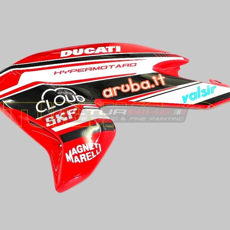 Kit avec conception personnalisée Aruba équipe pour carénages Ducati Hypermotard 821/939. Fabriqué avec des films professionnels de longue durée, idéal pour installer sur les motos rouges ou noires.