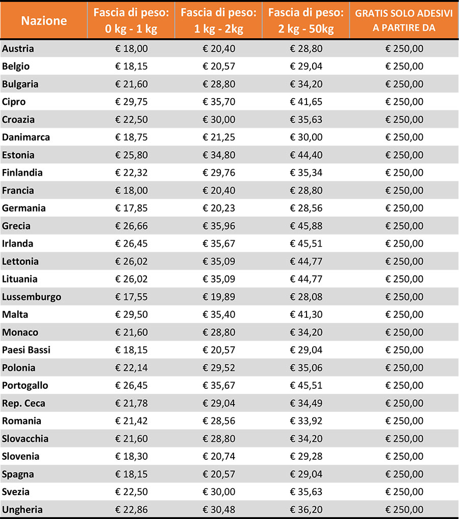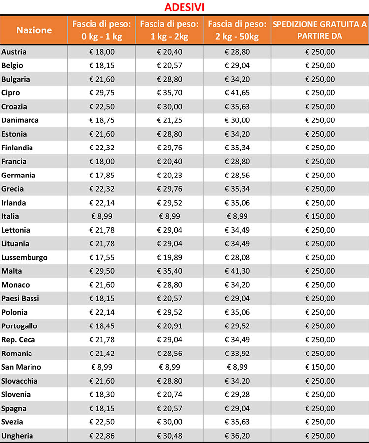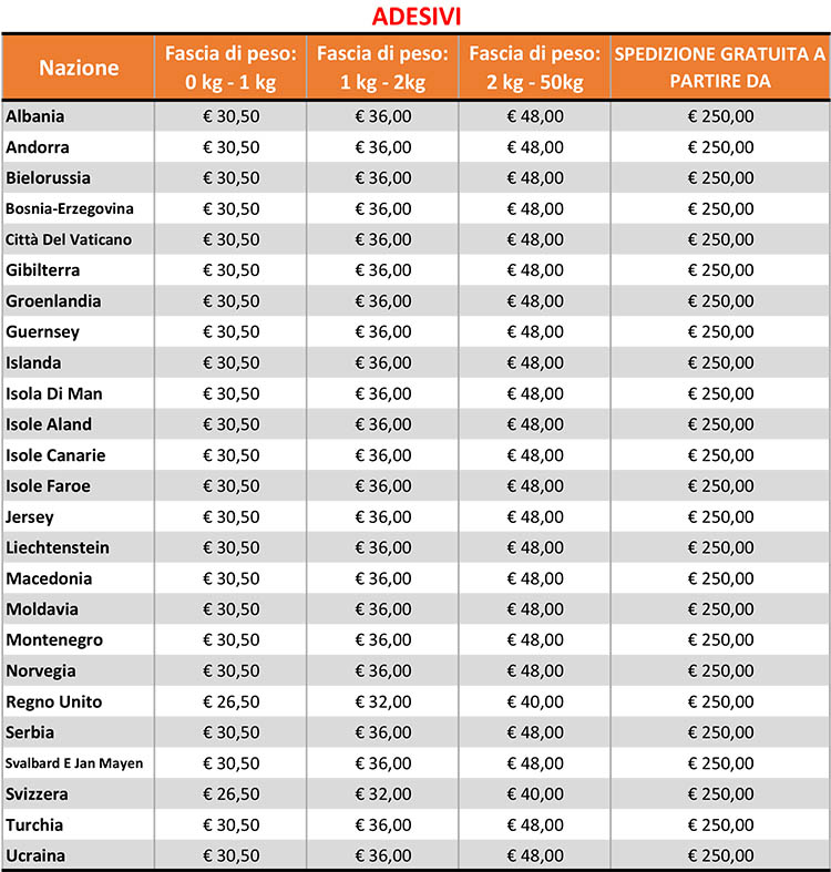 Gli ordini spediti nei Paesi dell'Unione Europea (ad eccezione dell'Italia) prevedono SPESE DI TRASPORTO GRATUITE con una spesa minima di 250 €, SOLO ED ESCLUSIVAMENTE PER L'ACQUISTO DI ADESIVI.