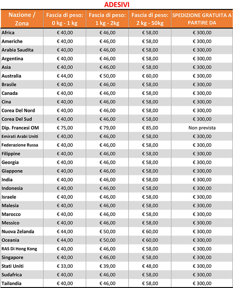 Gli ordini spediti nei Paesi al di fuori dell'Unione Europea prevedono SPESE DI TRASPORTO GRATUITE con una spesa minima di 300 €, SOLO ED ESCLUSIVAMENTE PER L'ACQUISTO DI ADESIVI. Per ordini inferiori o che contengono prodotti diversi dagli ADESIVI, il costo di trasporto verrà calcolato in funzione della tipologia di articoli presenti all'interno del carrello