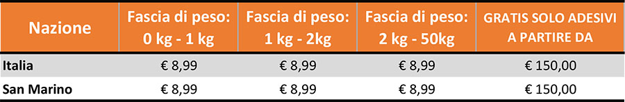 Gli ordini spediti nel territorio italiano prevedono SPESE DI TRASPORTO GRATUITE con una spesa minima di 150,00 €, SOLO ED ESCLUSIVAMENTE PER L'ACQUISTO DI ADESIVI.